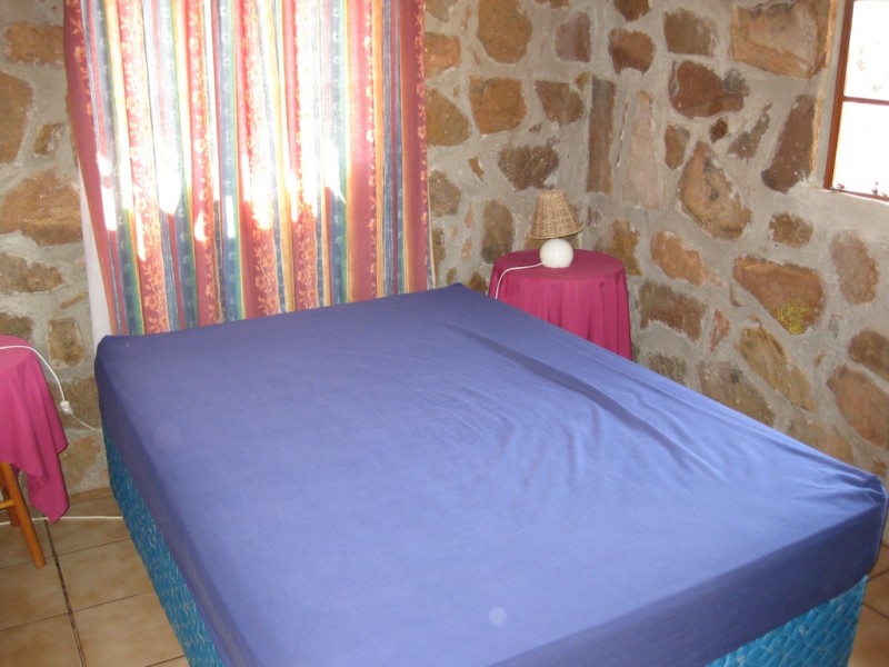 The camping and caravan sites (wkday: R40, wkend: R60) have water taps, electricity (R10/day), and braai pits (bring your own wood or buy it at the main camp office) with bathroom and shower facilities in a central building. The log cabins (wkday: s R300, d R600, R250/additional person, wkend: s R350, d R700, R300/additional person) sleep up to six people in two bedrooms and an upstairs loft. There is a full kitchen, indoor fireplace and braai pit outside. The stone chalets (wkday: s R250, d R500, R200/additional person, wkend: s R300, d R600, R250/additional person) sleep up to four people in two bedrooms with a full kitchen, indoor fireplace and braai pit outside. Both the log cabins and the stone chalets require a minimum of two nights stay over the weekend with a minimum of two people. Bedding and towels are not included in the above prices (extra R50-100/unit) and if needed, should be arranged with the office when booking.