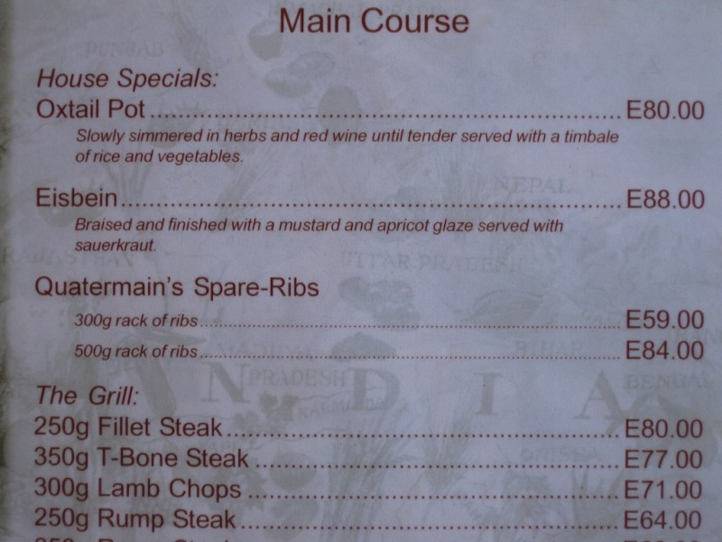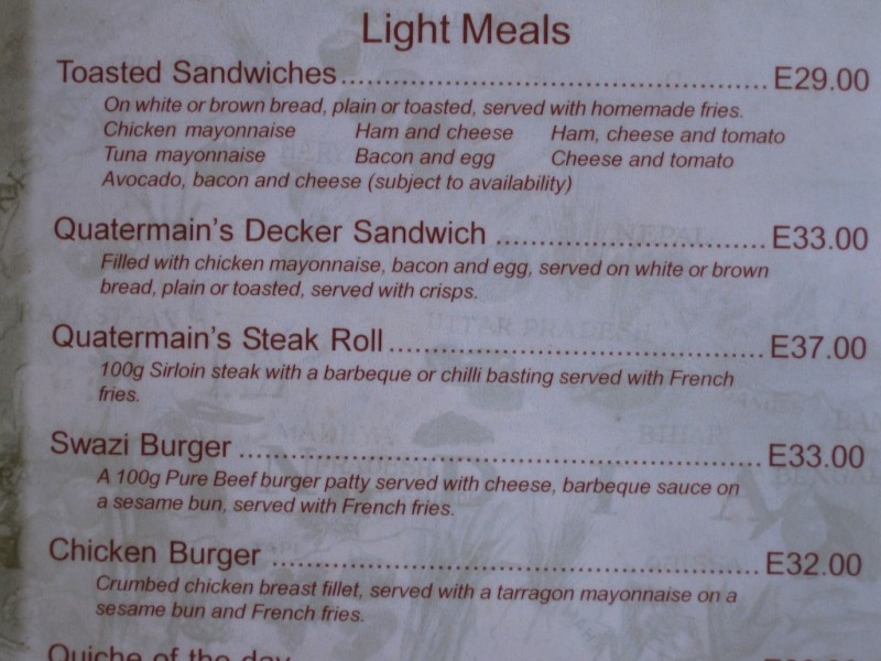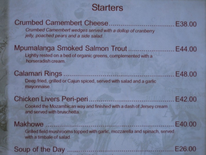 Quarterman's Restaurant & Pub is a large dark wood pub with indoor and outdoor seating. The menu has a large sushi selection in addition to standard fare. Say what you want about sushi in Swaziland but the pub draws a loyal following of expats and tourists in the evenings. Wifi is available (R25/hr).