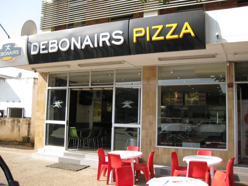 Debonairs Pizza is a South African pizza chain with skimpy pizzas, but they do free delivery within a 7 km radius.